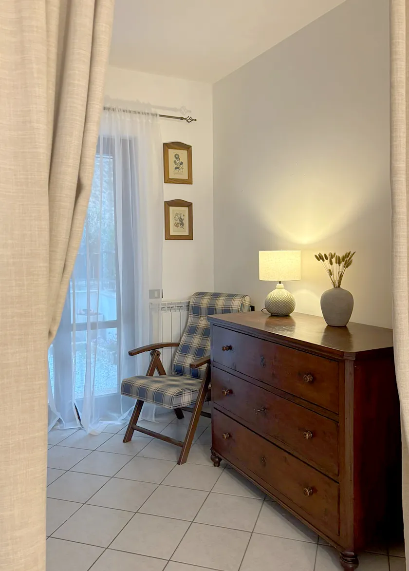 Un incantevole giardino privato immerso nel verde renderà ancora più piacevoli i tuoi momenti di relax, con due comode sdraio a tua disposizione.